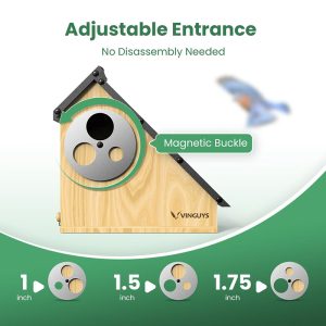 [3-in-1 Adjustable Entrance] Featuring a unique magnetic rotating plate that adjusts the entry hole to 1″, 1.5″, or 1.75″, attracting various birds like Bluebirds, Chickadees, and Woodpeckers.