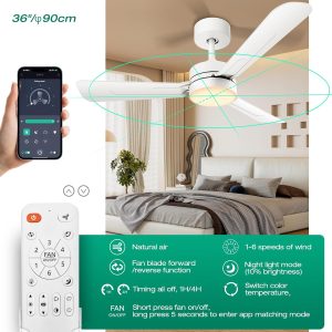 - Remote+APP Control: This ceiling fan light can control the fan and light individually by remote control or APP. With 6 levels of wind speed, 3 color temperature LED lights, reverse mode, timer mode, memory function and natural wind mode, the perfect combination allows you to enjoy a comfortable smart home experience.