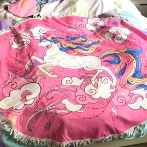 Round Unicorn Beach Towel with Tassels, Large Microfiber Mandala Sandproof Beach Blanket, Designer Hand-Drawn Magic Unicorn Bath Towel