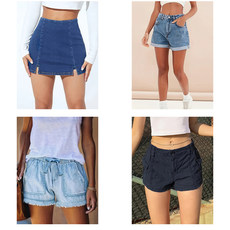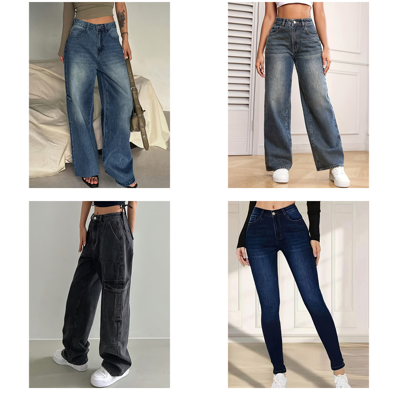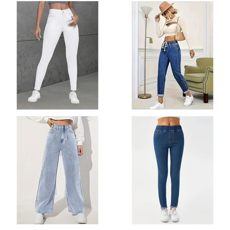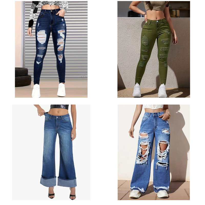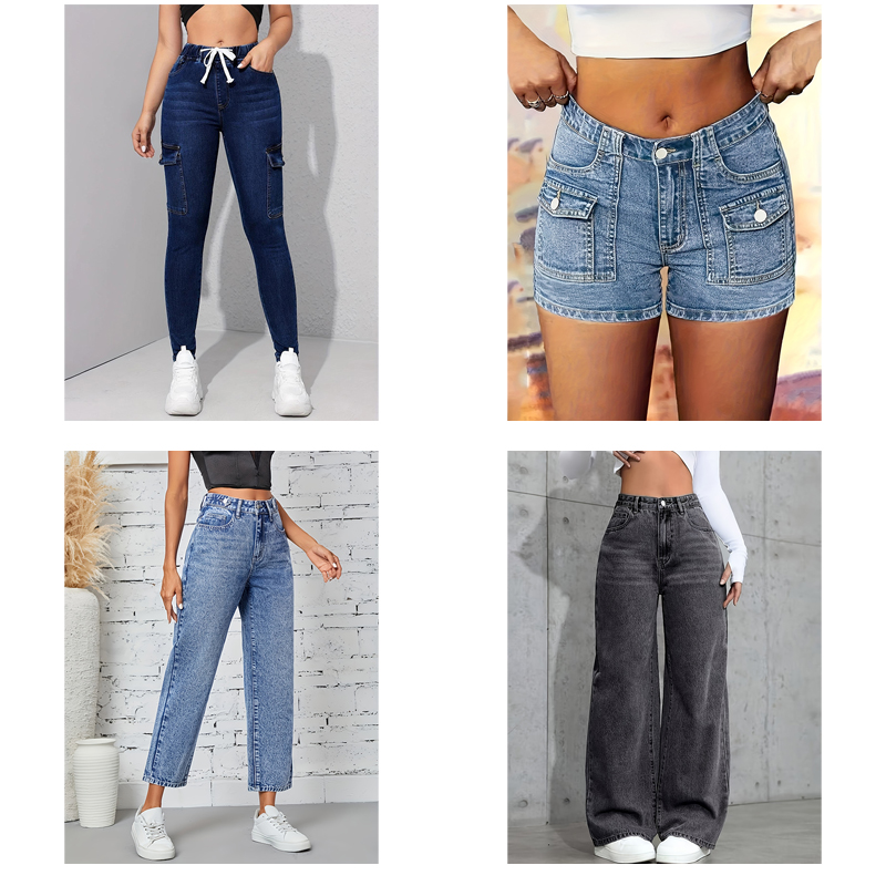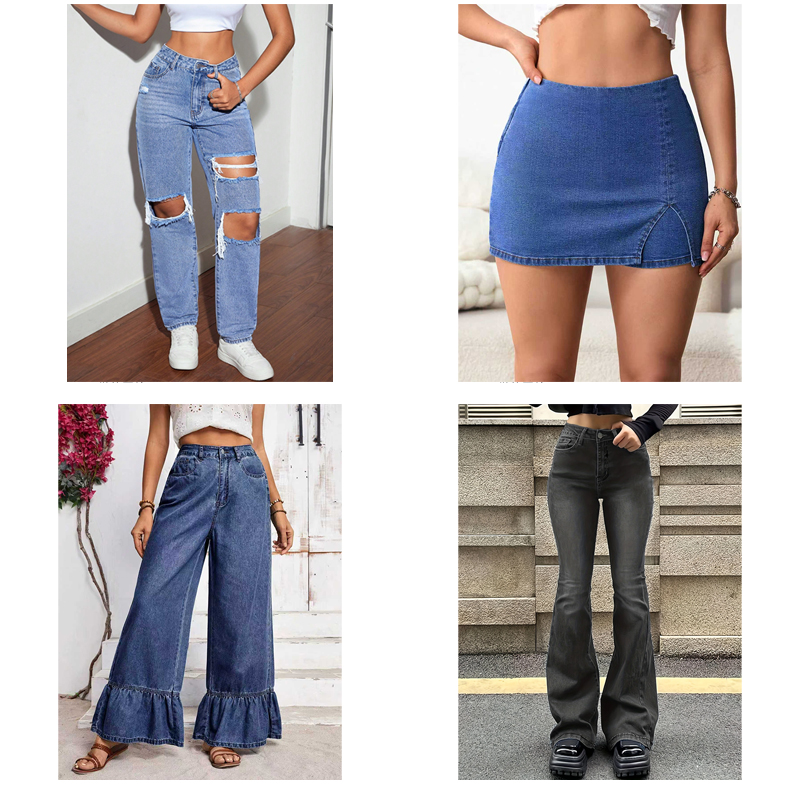 Choose from a wide range of designs including classic skinnies, trendy wide-legs, distressed ripped jeans, and chic denim skirts to match any occasion.